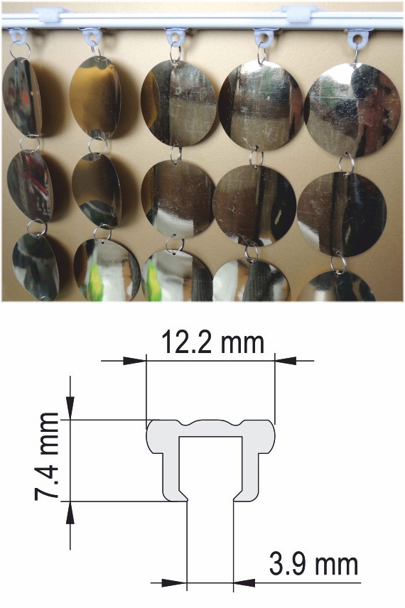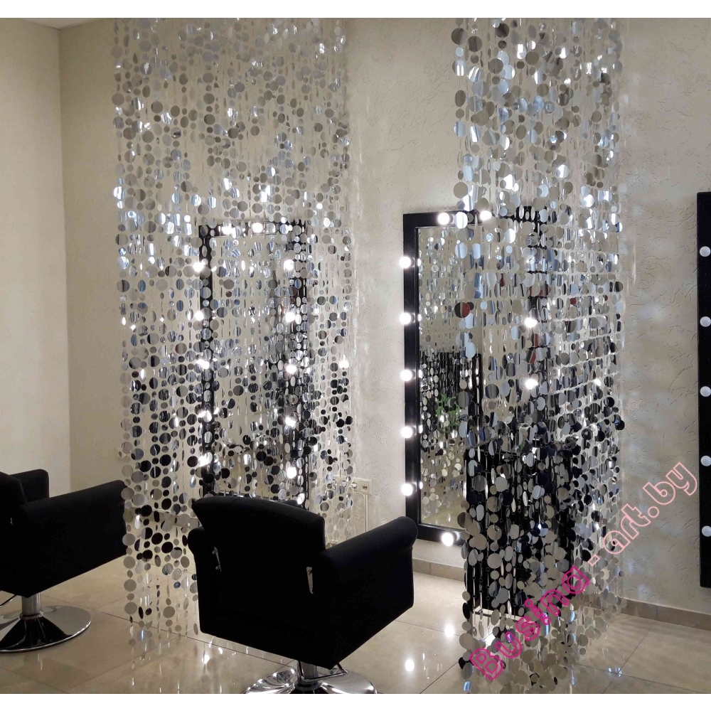 Крепление штор из зеркальных дисков на аллюминиевом карнизе на неподвижных бегунках к потолку - это самый распространенный вариант. Максимальная длина карниза 6 м, делаем любой длины. Есть и другие варианты карнизов . В данном случае Вы получаете штору и карниз, Вам только необходимо закрепить крепеж для карниза и "защелкнуть" в него карниз, потом развесить штору.| Системные параметры | ||